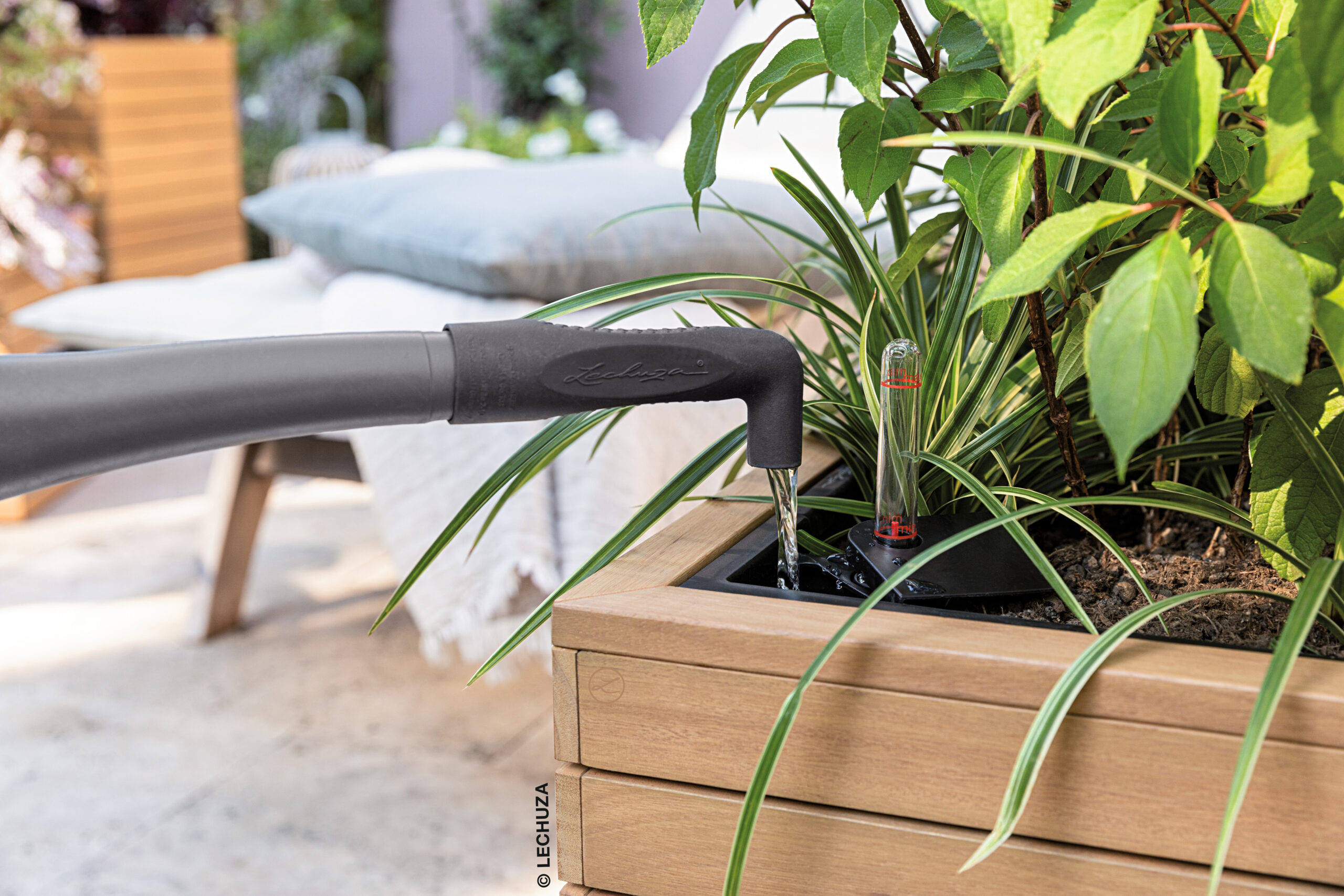 Elke Lechuza plantenbak is uitgerust met een geïntegreerd reservoir en een speciaal substraatsysteem. Jij vult het reservoir eenvoudig via de vulopening, waarna het substraat het water gelijkmatig verdeelt. De wortels nemen precies de juiste hoeveelheid op – nooit te veel en nooit te weinig.